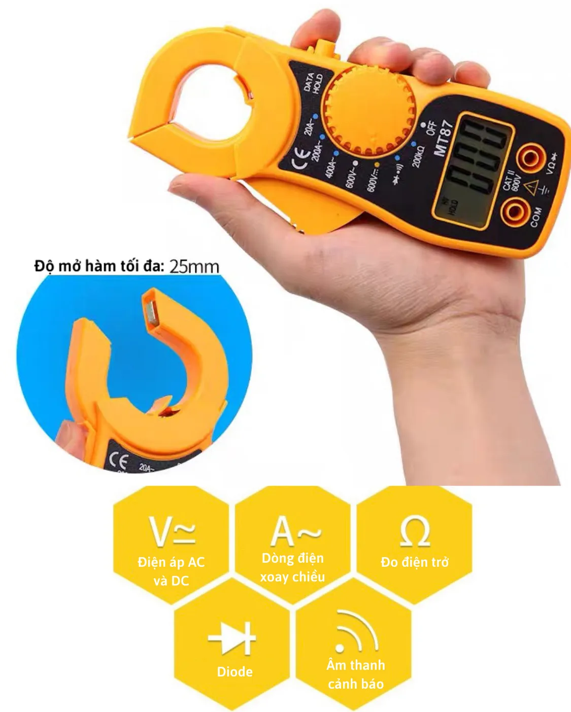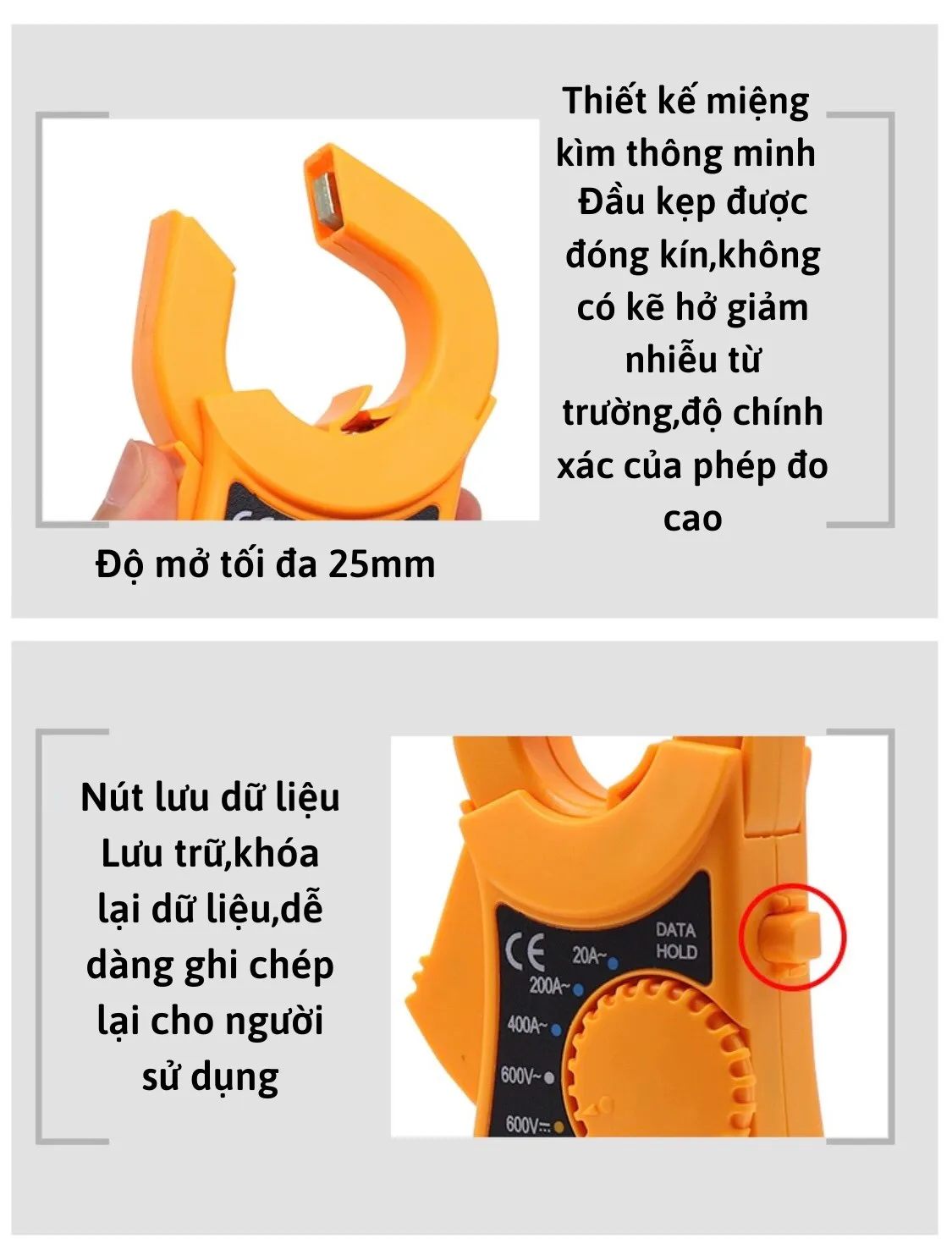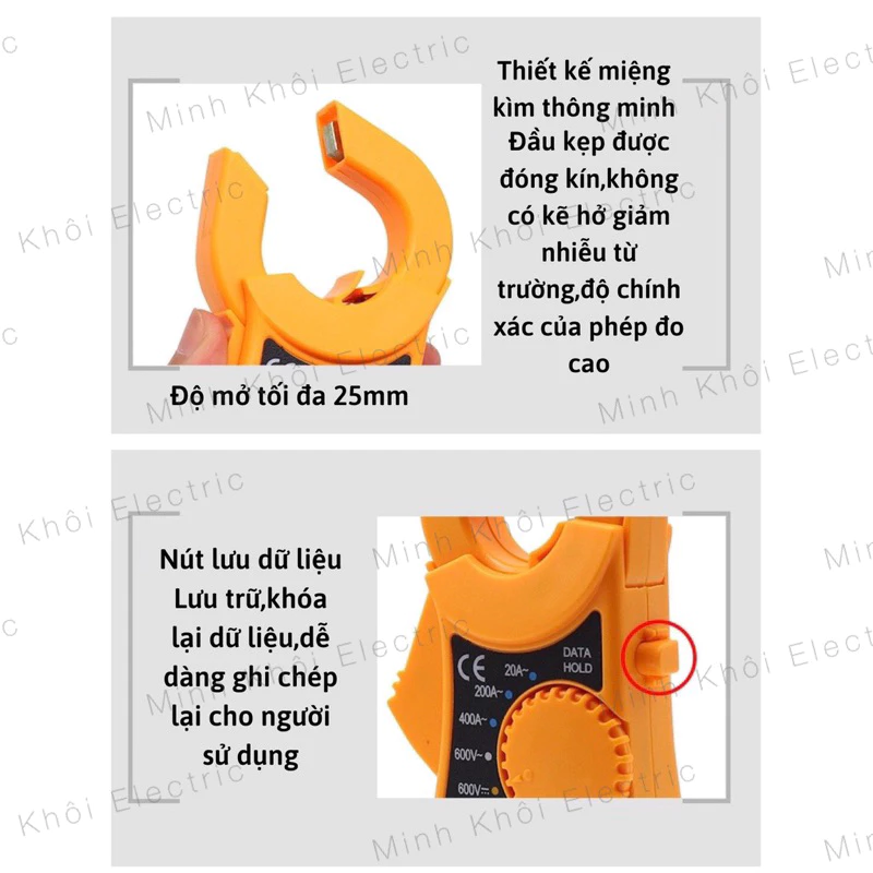 – Thang đo dòng điện xoay chiều (ACA): 2A /20A / 200A, sai số ±(1.5%+5)