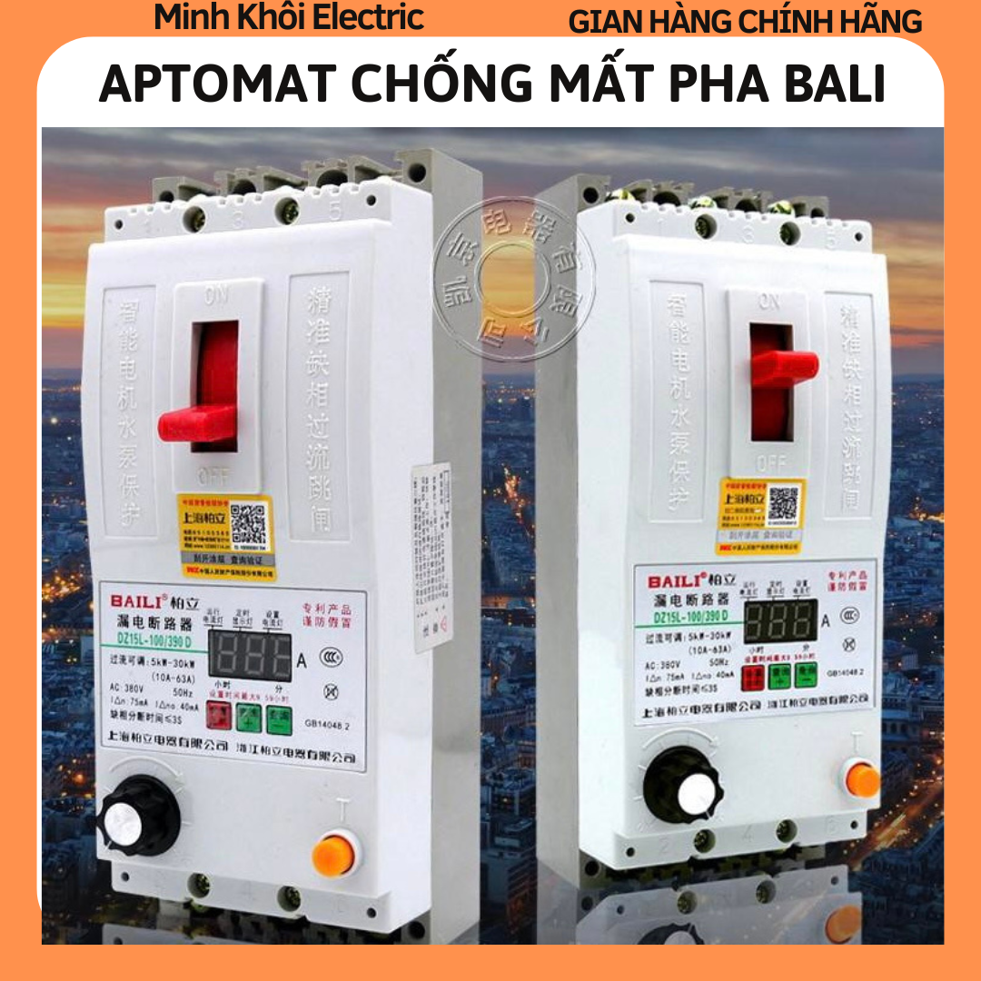 attomat chống mất pha Bali, aptomat bảo vệ mất pha Bali,40A 63A 100A, Cầu Dao Bảo Vệ Mất Pha Công Suất 1.1 KW – 30 KW – 100A