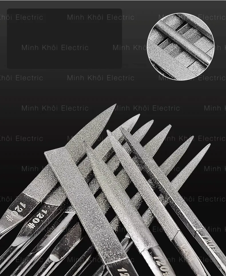 + Dũa mô hình bán nguyệt 1 mặt, dũa mo hình bán nguyệt 2 mặt, dũa tam giác lớn bề ngang rộng 4.5mm