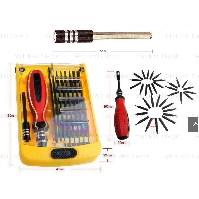 Bộ sản phẩm gồm 36 đầu vít, 1 đầu vặn vít và 1 nhíp được làm từ chất liệu thép không gỉ nên rất bền chắc. Bộ có nhiều kiểu đầu vít khác nhau như: đầu dẹt, tam giác, lục giác, 3 cạnh, 4 cạnh, 5 cạnh và 6 cạnh, mỗi dạng đều có đủ các cỡ từ lớn đến nhỏ để bạn thoải mái sử dụng tùy vào mục đích.