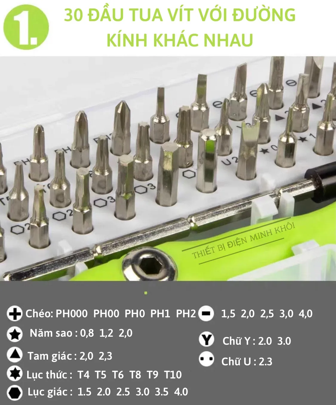 – 12 đầu lục giác: H1.5, H2.0, H2.5, H3.0, H3.5, H4.0, T4, T5, T6, T8, T9, T10.