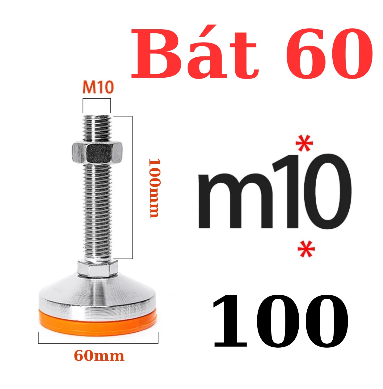 Chân tăng chỉnh chịu lực phi 60mm inox 304,chân đế chịu lực, chân đế tăng chỉnh, chân tăng chỉnh đế, giá đỡ chân – M10x100 bát 60mm