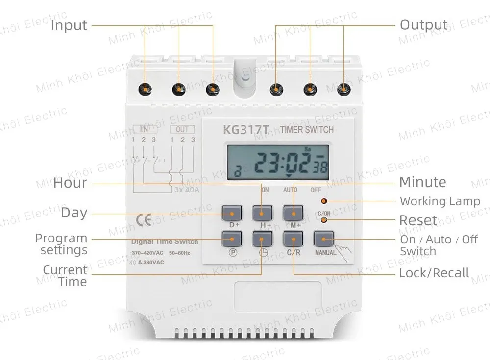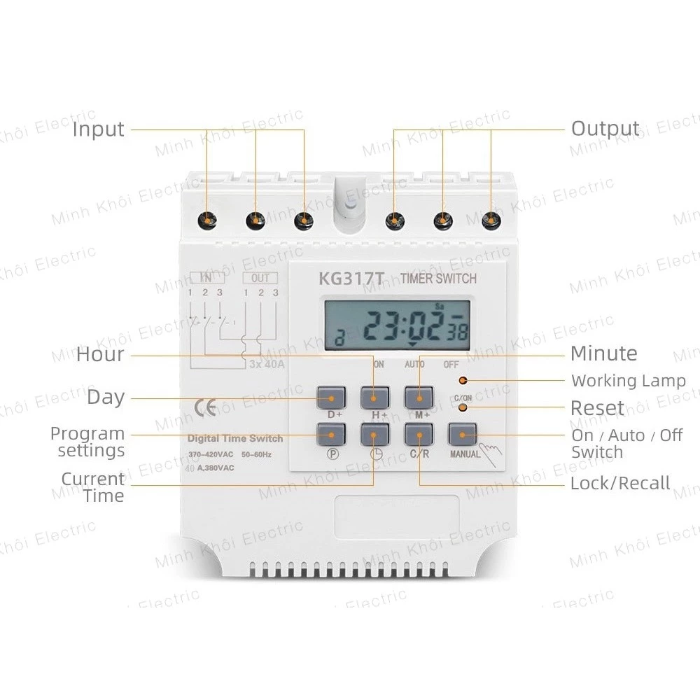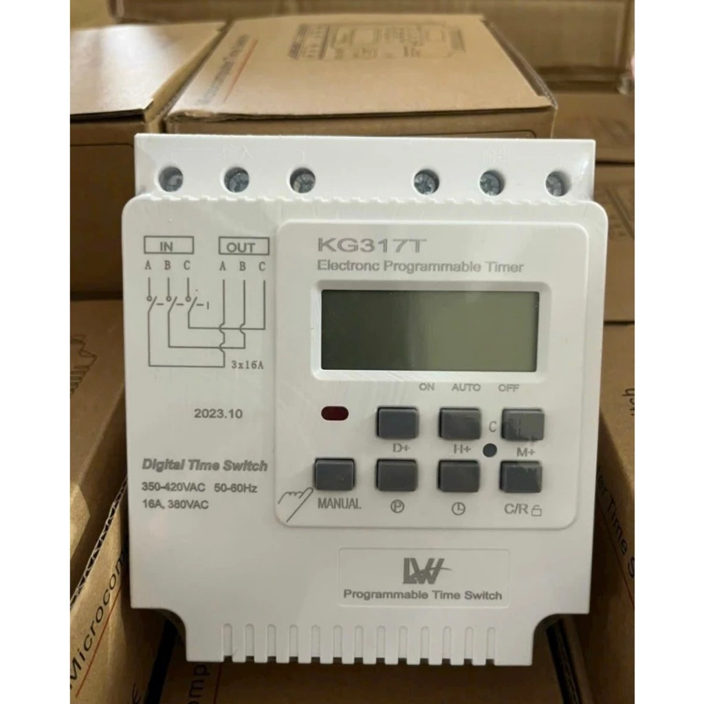 Công tắc hẹn giờ cho thiết bị 3 pha (hay còn được gọi nhiều tên khác nhau như công tắc hẹn giờ công suất lớn, bộ hẹn giờ, timer điện tử, thiết bị hẹn giờ) là rơ le hẹn giờ bật tắt tự động theo chương trình cài đặt trước dùng cho động cơ 3 pha 380V gồm 28 chương trình ON/OFF. Thời gian hẹn giờ tối thiểu 1 phút, có pin nhớ chương trình khi mất điện sẽ không phải cài đặt lại. Công tắc hẹn giờ 3 pha được ứng dụng hẹn giờ cho các thiết bị điện 3 pha 380V mà không cần đấu qua bộ khởi động từ như: máy bơm, hấp máy móc, máy nước nóng, biển quảng cáo, quạt thông gió, tủ điện công nghiệp vv. . và các thiết bị khác an toàn, đáng tin cậy, hiệu suất ổn định, là một sự lựa chọn rất tốt.