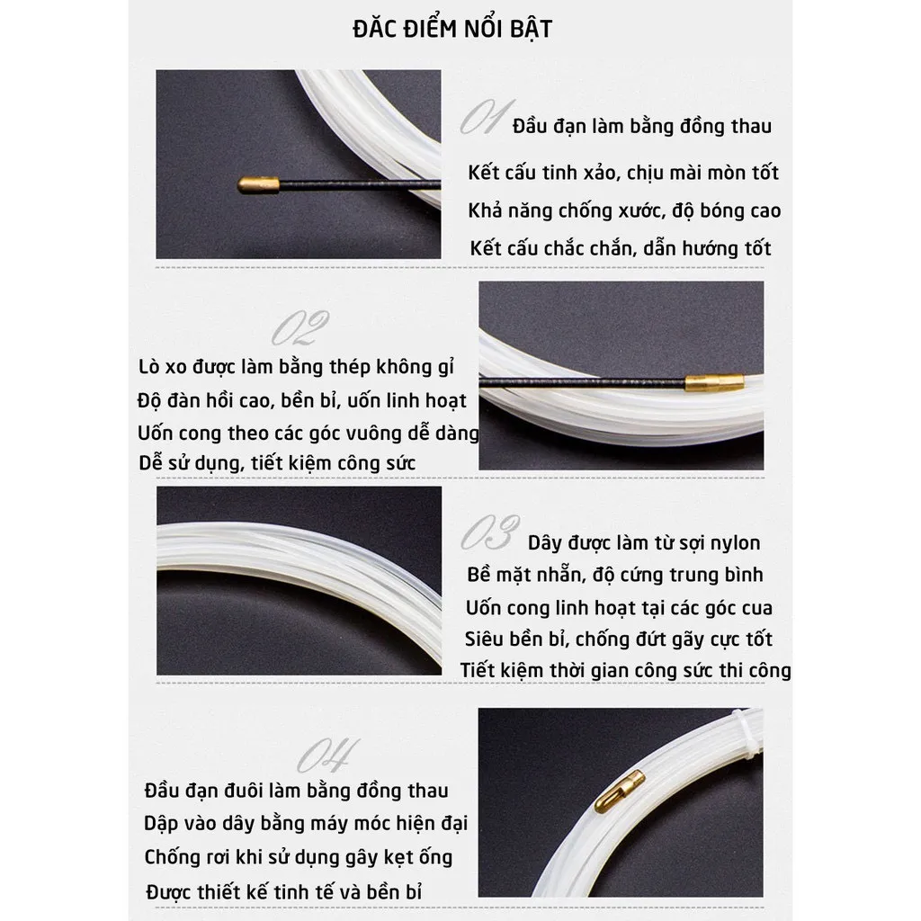 – Độ cứng phù hợp giúp dây mồi dễ dàng luồn trong ống có độ dài lớn