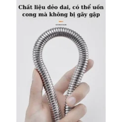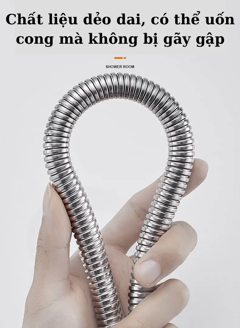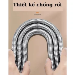 – Lớp ngoài được cấu tạo từ những sợi inox 304, gồm 7 sợi nhỏ mỗi sợi phi 0.2mm gộp lại thành các sợi to được đan kép vào nhau giúp sản phẩm có độ bền cao. Xen kẽ dây inox là dây đồng nguyên chất cũng gồm 7 sợi nhỏ làm tăng độ thẩm mỹ cho dây xả.