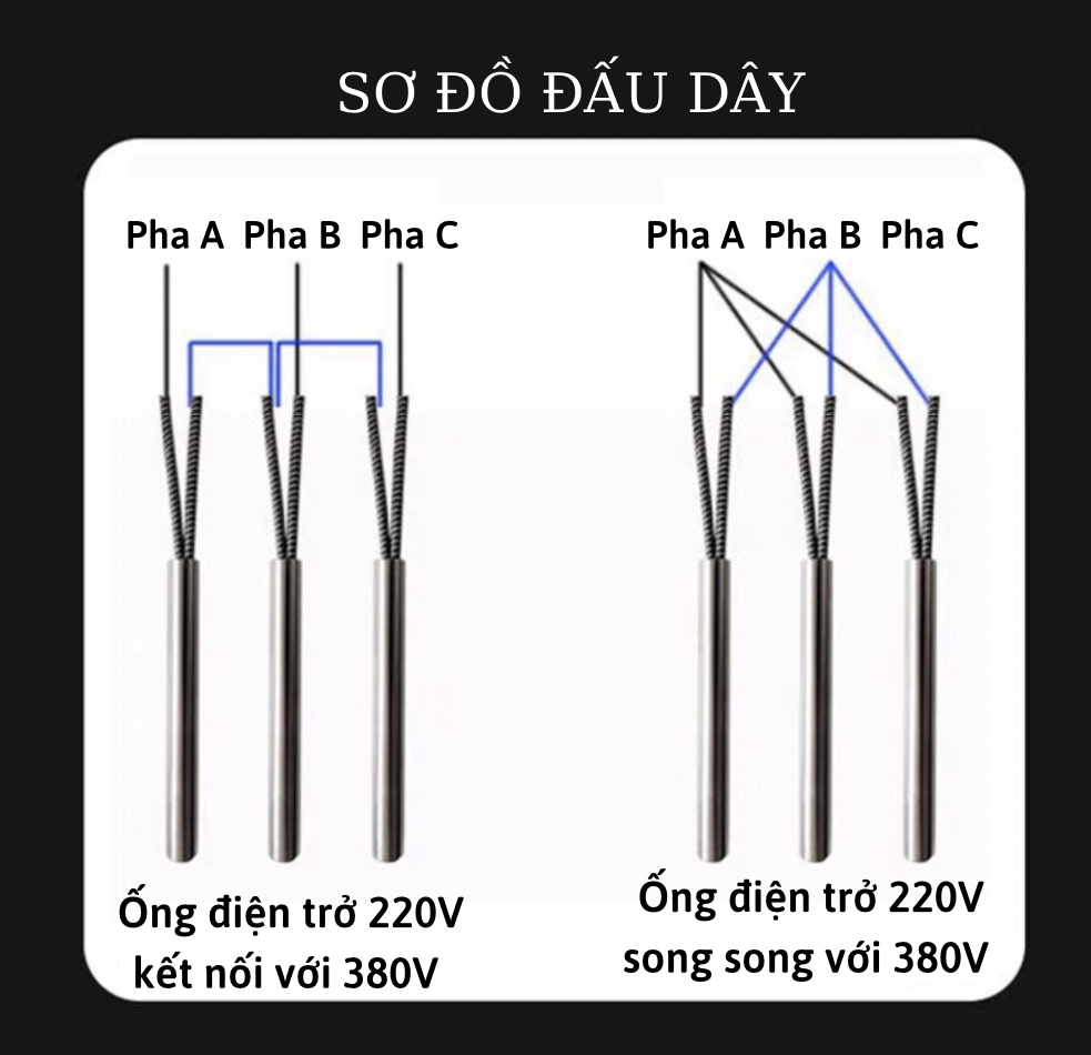 Công suất: Từ 75W đến 1500W tùy thuộc vào đường kính, độ dài ty nhiệt. Ty nhiệt càng dài công suất càng lớn