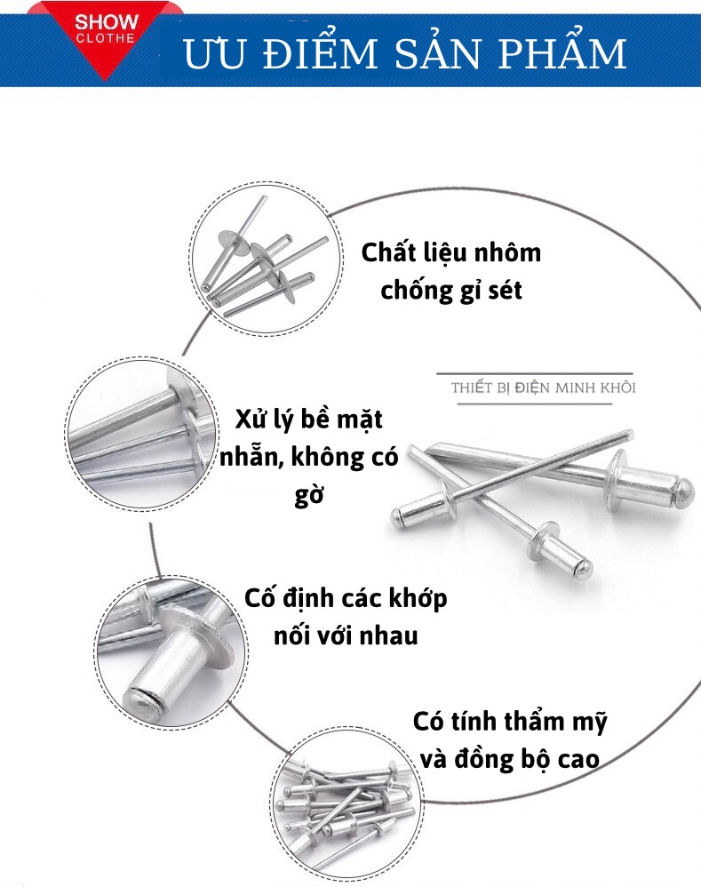 – Các sản phẩm đinh rút nhôm được xử lí màu sáng, sáng bóng, có khả năng chống rỉ rét, ăn mòn từ môi trường tự nhiên.