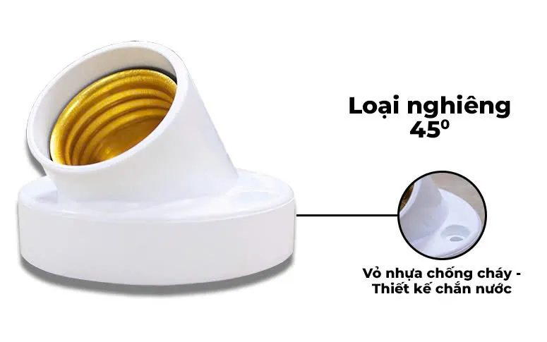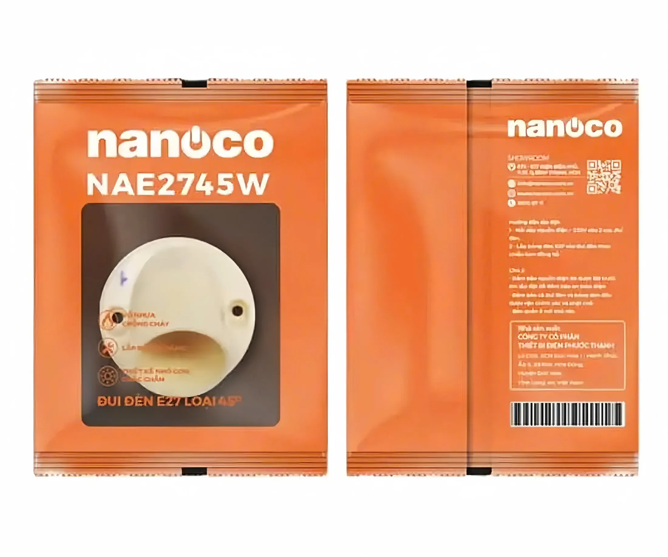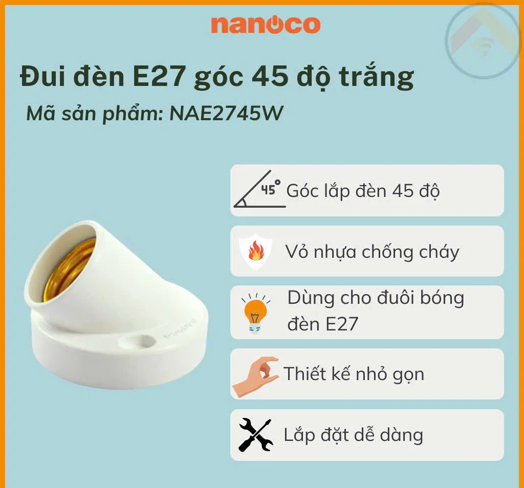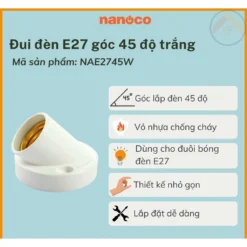 Đui đèn E27 Nanoco NAE2745W/ NAE2745BK là đui đèn loại nghiêng 45 độ, sử dụng cho các loại bóng đèn thông dụng nhất hiện nay như: các bóng đèn Led, bóng đèn sợi đốt, bóng đèn compact, bóng chữ U…..