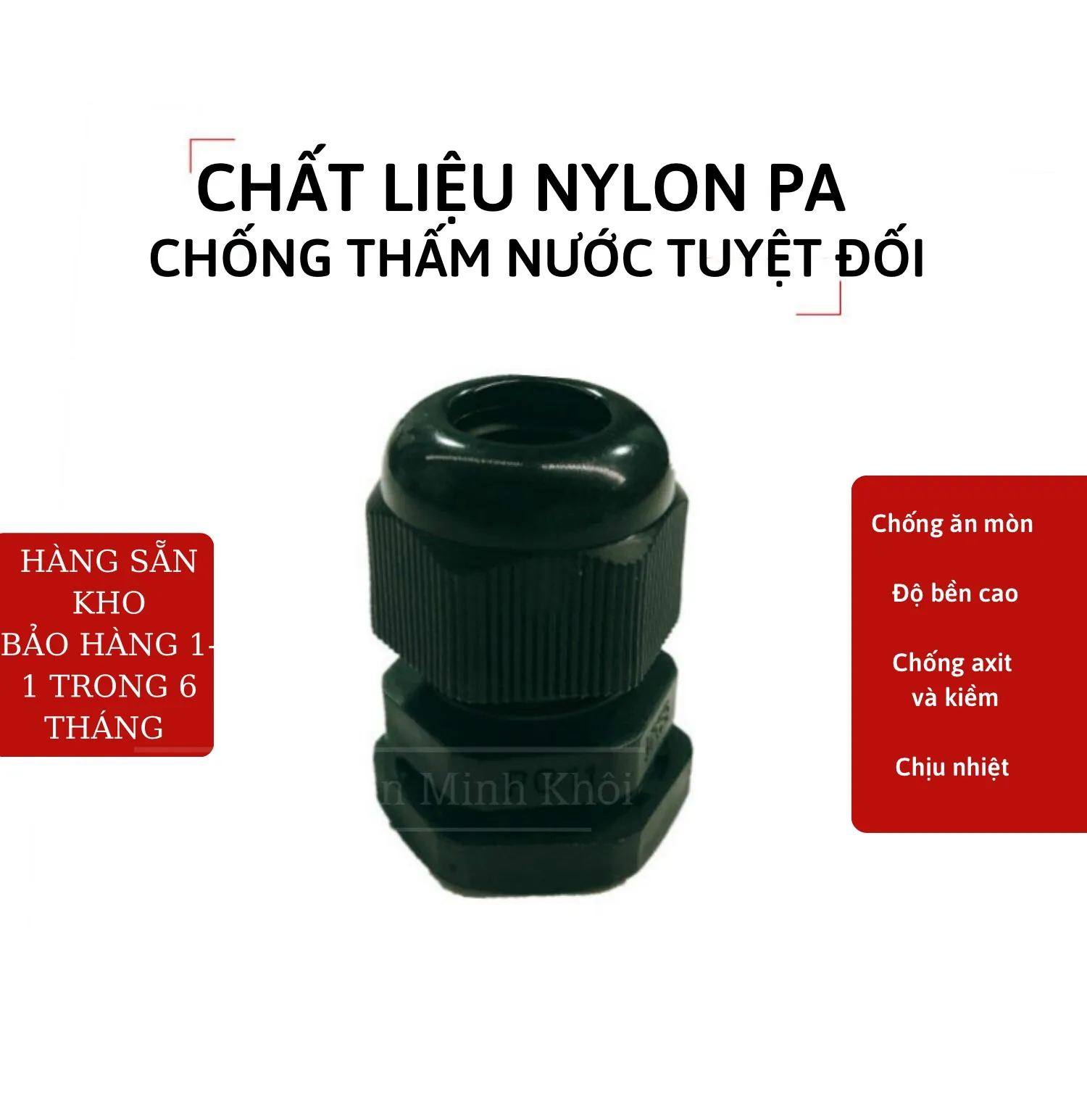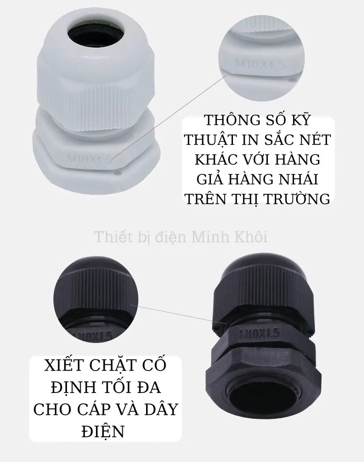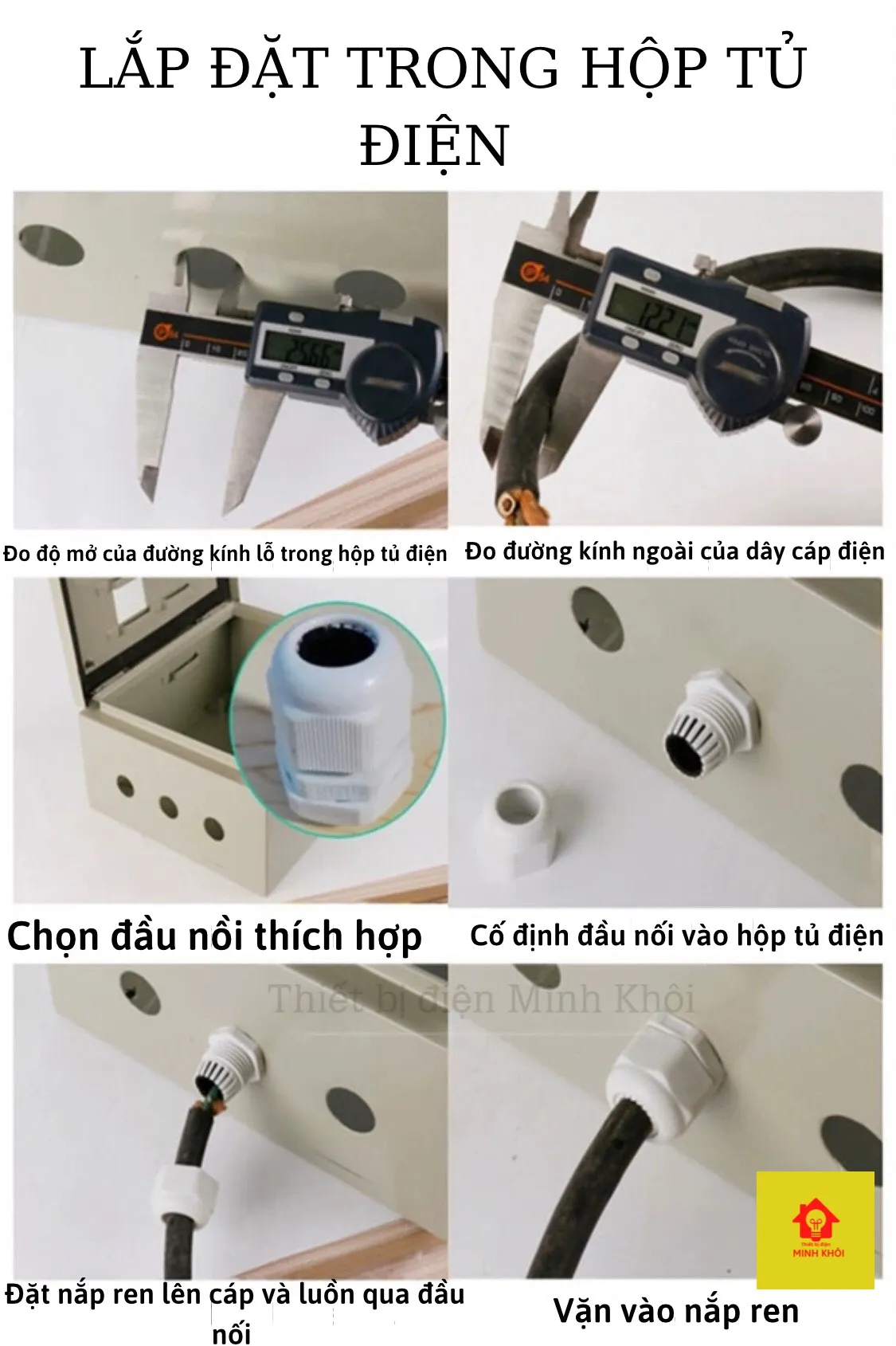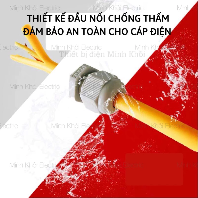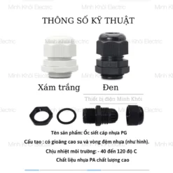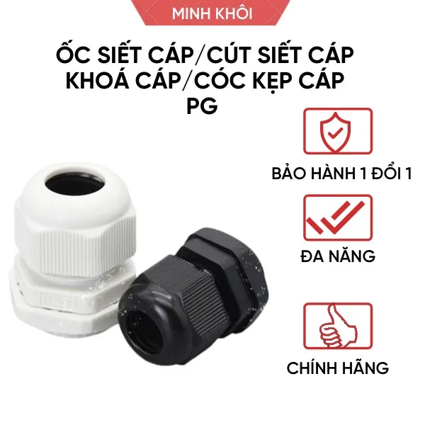 Ốc siết cáp giữ dây điện, khóa cáp – kẹp cáp điện chống nước Dùng kẹp giữ vỏ dây cáp điện khi đấu nối vào vỏ hộp điện, ổ cắm, thiết bị điện. Chỉ số chống nước ip68. Giữ vỏ dây (giữ cáp) không bị giằng kéo lõi ảnh hưởng đến đấu nối điện bên trong. Bóp giữ chặt vào vỏ dây cáp điện không để khe hở cho nước xâm nhập dễ dàng được.