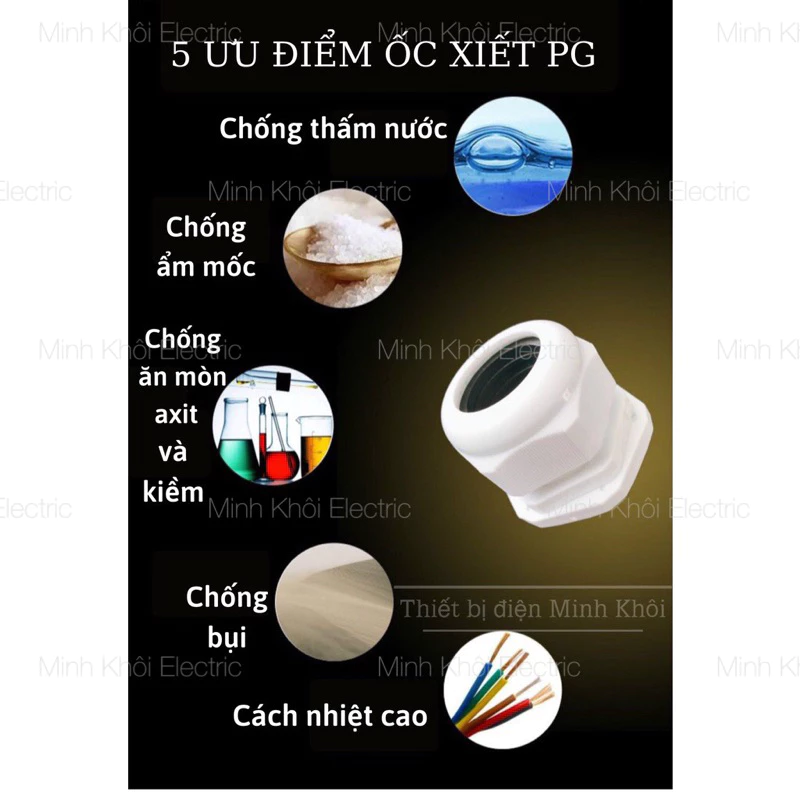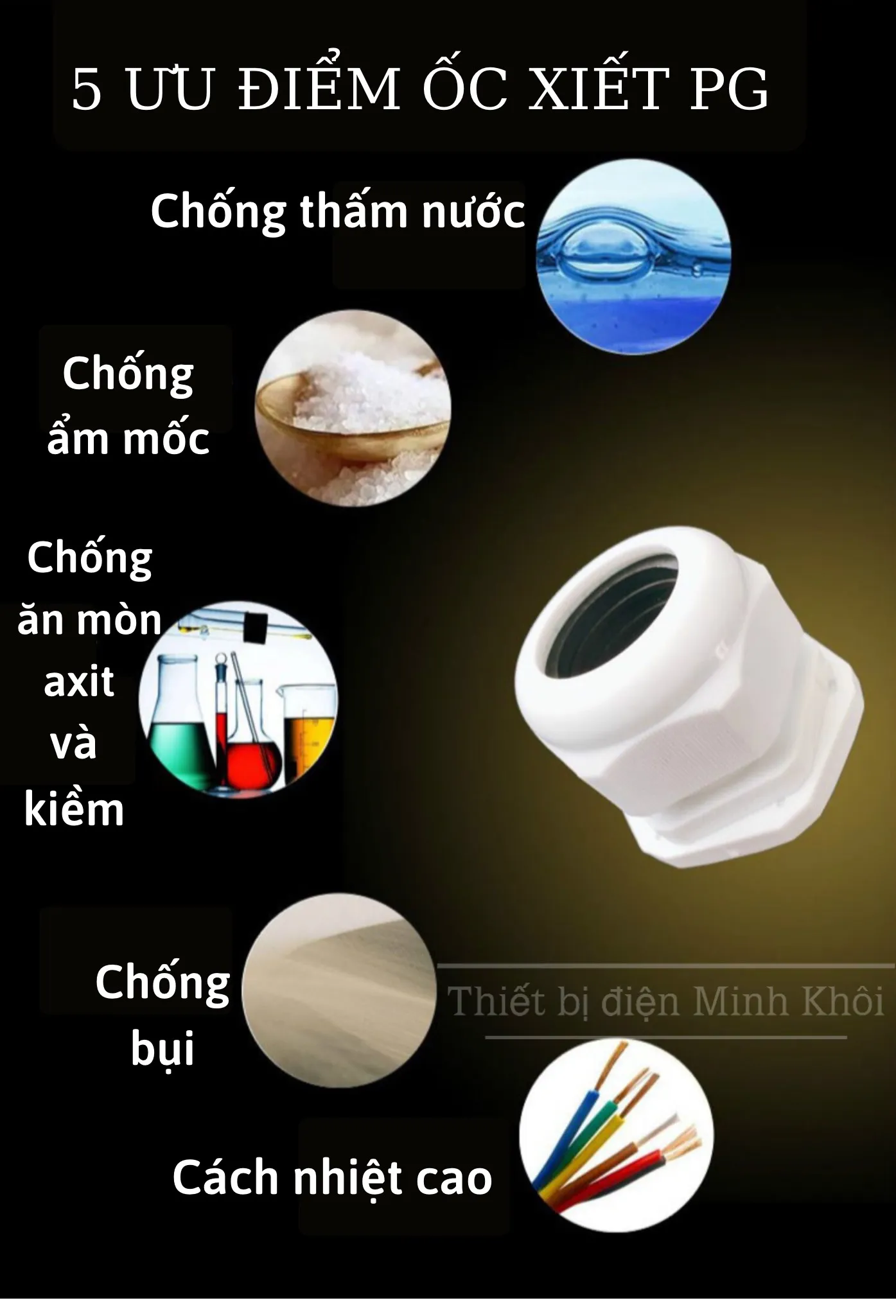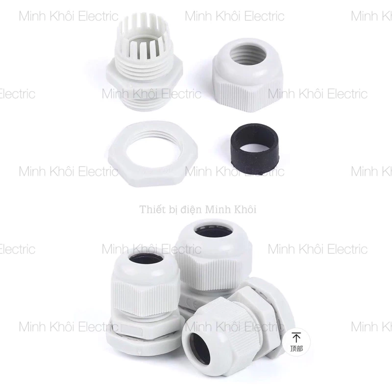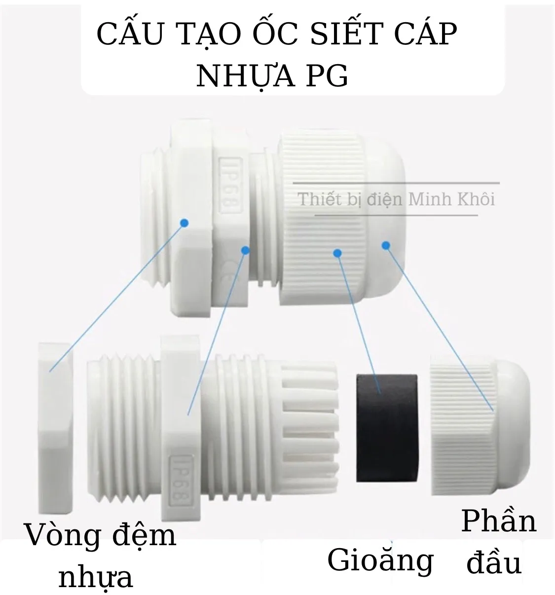 Ốc siết cáp giữ dây điện, khóa cáp – kẹp cáp điện chống nước Dùng kẹp giữ vỏ dây cáp điện khi đấu nối vào vỏ hộp điện, ổ cắm, thiết bị điện. Chỉ số chống nước ip68. Giữ vỏ dây (giữ cáp) không bị giằng kéo lõi ảnh hưởng đến đấu nối điện bên trong. Bóp giữ chặt vào vỏ dây cáp điện không để khe hở cho nước xâm nhập dễ dàng được.