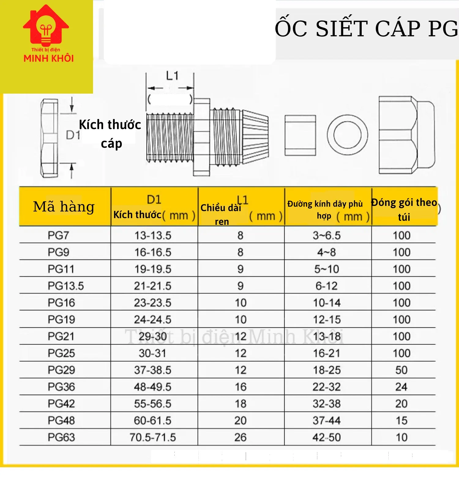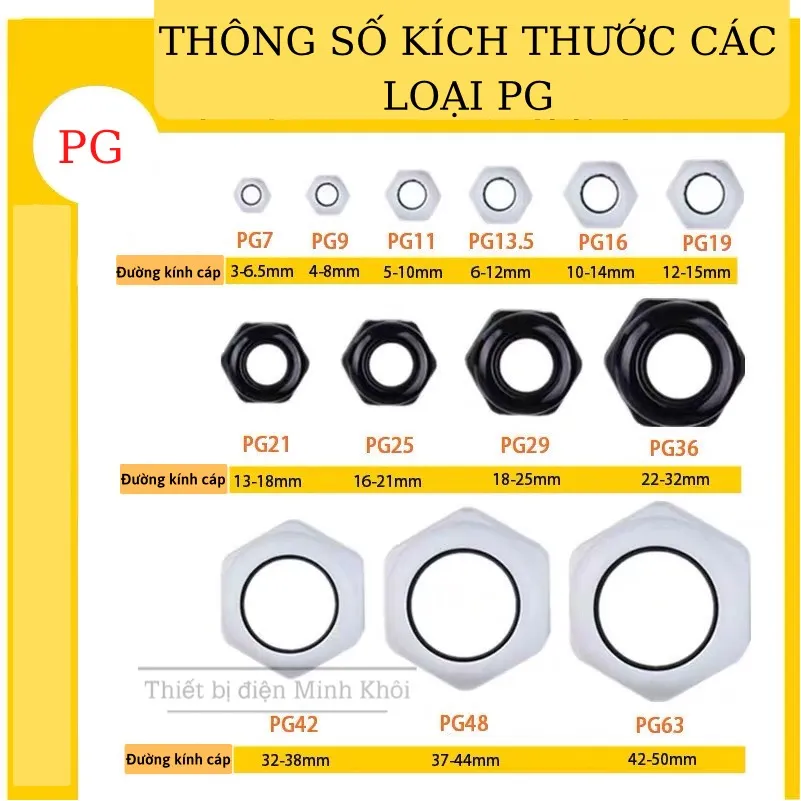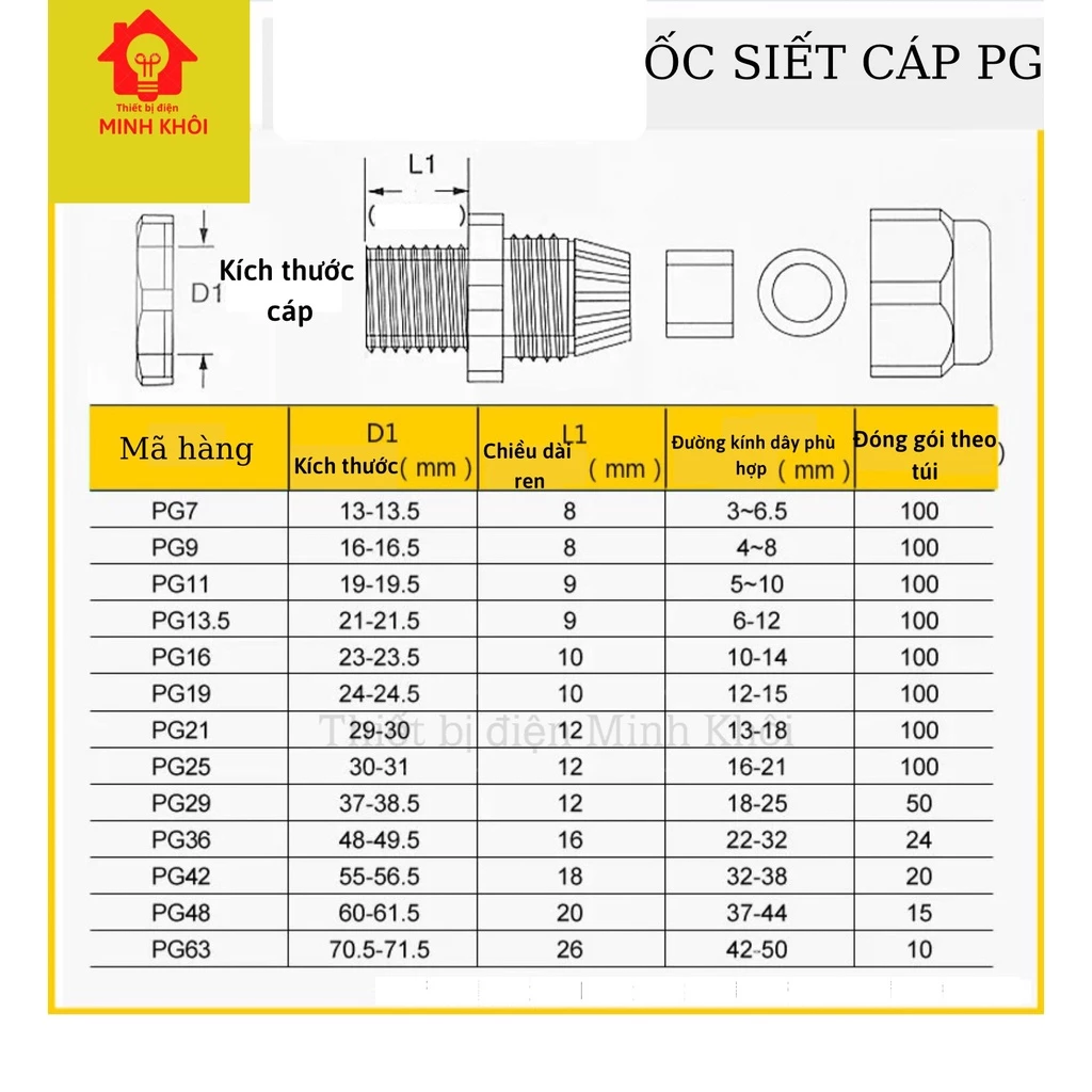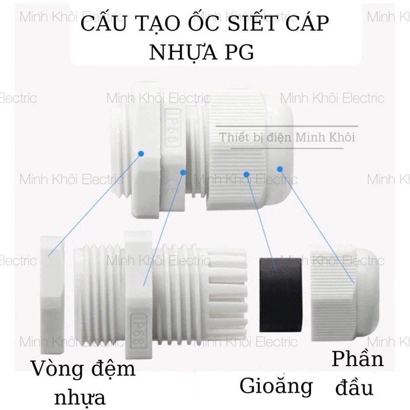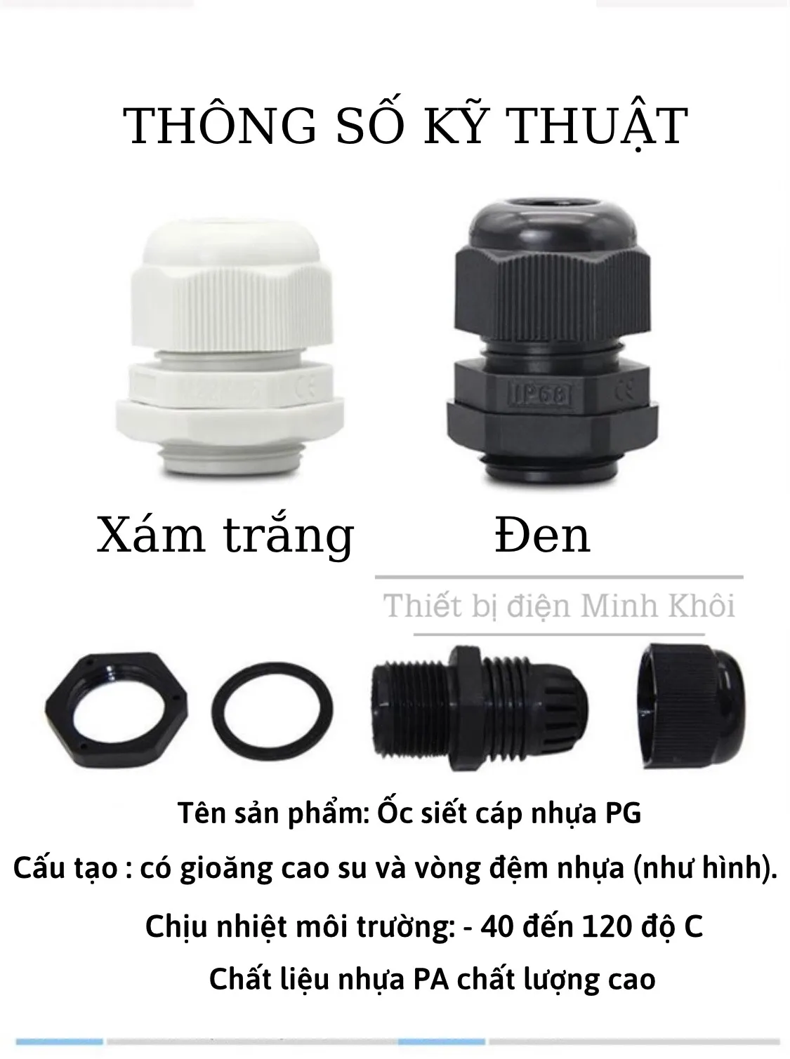 Ốc siết cáp giữ dây điện, khóa cáp – kẹp cáp điện chống nước Dùng kẹp giữ vỏ dây cáp điện khi đấu nối vào vỏ hộp điện, ổ cắm, thiết bị điện. Chỉ số chống nước ip68. Giữ vỏ dây (giữ cáp) không bị giằng kéo lõi ảnh hưởng đến đấu nối điện bên trong. Bóp giữ chặt vào vỏ dây cáp điện không để khe hở cho nước xâm nhập dễ dàng được.