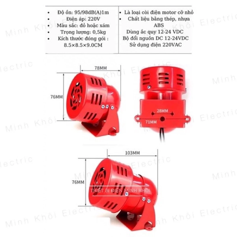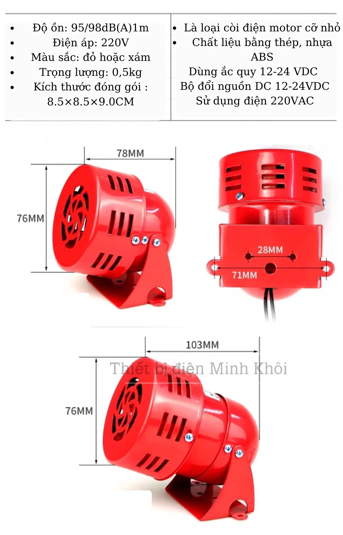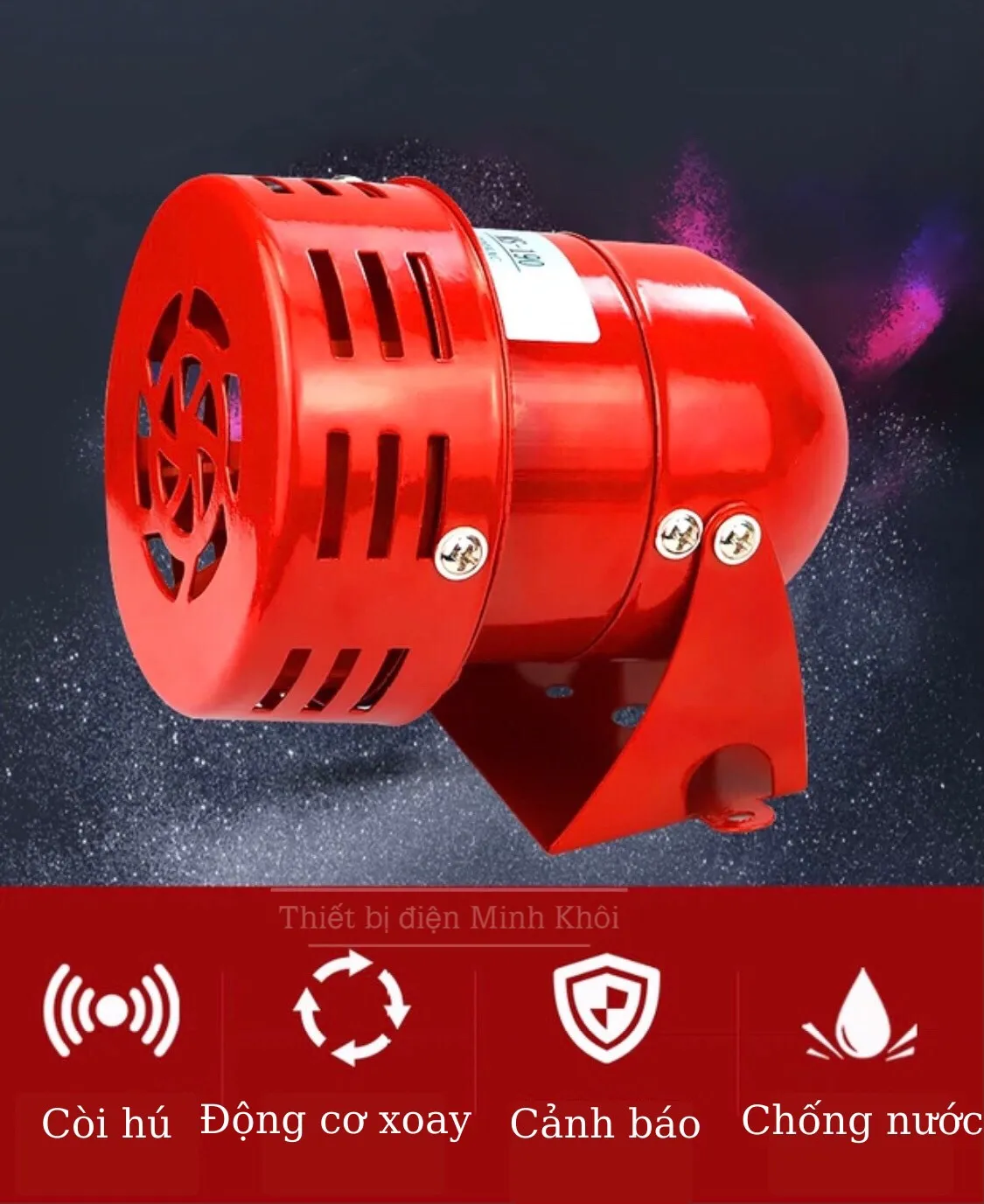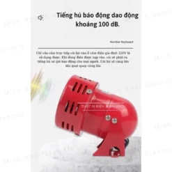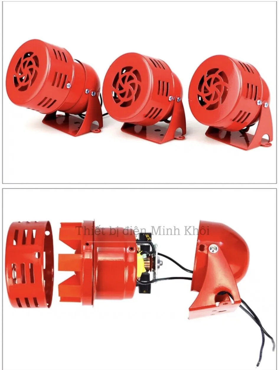 MS 190 Còi hụ báo động hú to, màu đỏ, điện áp 24VDC, 220VAC Còi hụ báo động hú to, màu đỏ, điện áp 24VDC, 220VAC MS 190 chủ yếu được sử dụng trong các môi trường công nghiệp khác nhau, chẳng hạn như nhà xưởng, nhà kho, trong các ngành công nghiệp khai thác mỏ,… (*) Thông số sản phẩm: + Mã hàng: MS 190 + Điện áp nguồn: 24VDC, 220VAC + Tần số: 50-60Hz + Độ ồn: ~ 100 dB + Công suất: 50W + Màu sắc: Màu đỏ + Chất liệu: Kim loại chổng mòn, gỉ (*) Đặc điểm sản phẩm: + Sản phẩm được làm bằng kim loại, đảm bảo độ bền, kiểu dáng nhỏ gọn. + Dùng quạt thổi gió tạo nên tiếng hụ vang với cường độ âm thanh tăng dần và tiếng vang ấm. + Có thể dùng kèm với thiết bị chống trộm hoặc cảm ứng hồng ngoại có chức năng mở rộng thêm thiết bị, báo động công trường, nhà xưởng, biệt thự,… + Thiết kế chắc chắn, dễ dàng lắp đặt và sử dụng. (*) Có giá sỉ cho khách hàng khi mua số lượng nhiều. (*) Chính sách hỗ trợ bán hàng: ✔️ Hỗ trợ vận chuyển trên toàn quốc. ✔️ Hỗ trợ và tư vấn về sản phẩm, lắp đặt trực tiếp qua Zalo 24/24 khi khách hàng có yêu cầu. ✔️ Cam kết về chất lượng sản phẩm, hoàn tiền 💯% nếu phát hiện hàng kém chất lượng, sai mẫu mã. (*) Thông tin liên hệ bảo hành: CÔNG TY TNHH THIẾT BỊ ĐIỆN MINH KHÔI Hotline hỗ trợ 096.298.1499 Hỗ trợ kỹ thuật: 091.222.6660 Giao hàng toàn quốc. MS 190 CÒI HỤ BÁO ĐỘNG HÚ TO, MÀU ĐỎ, ĐIỆN ÁP 24VDC, 220VAC – CAM KẾT VỀ CHẤT LƯỢNG SP