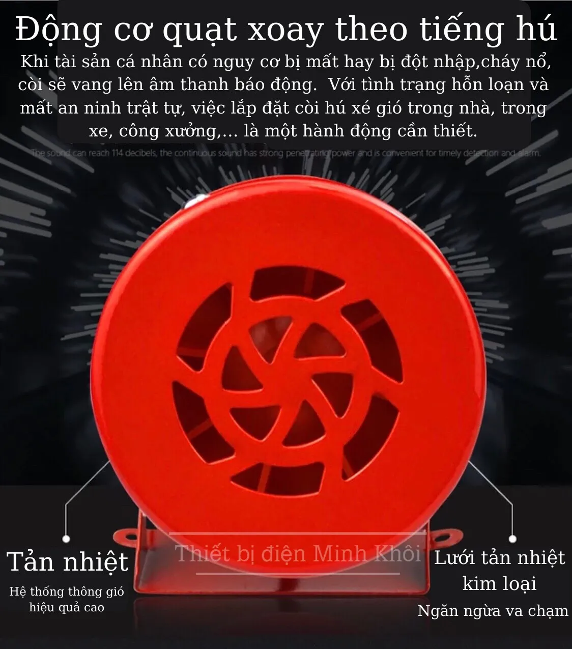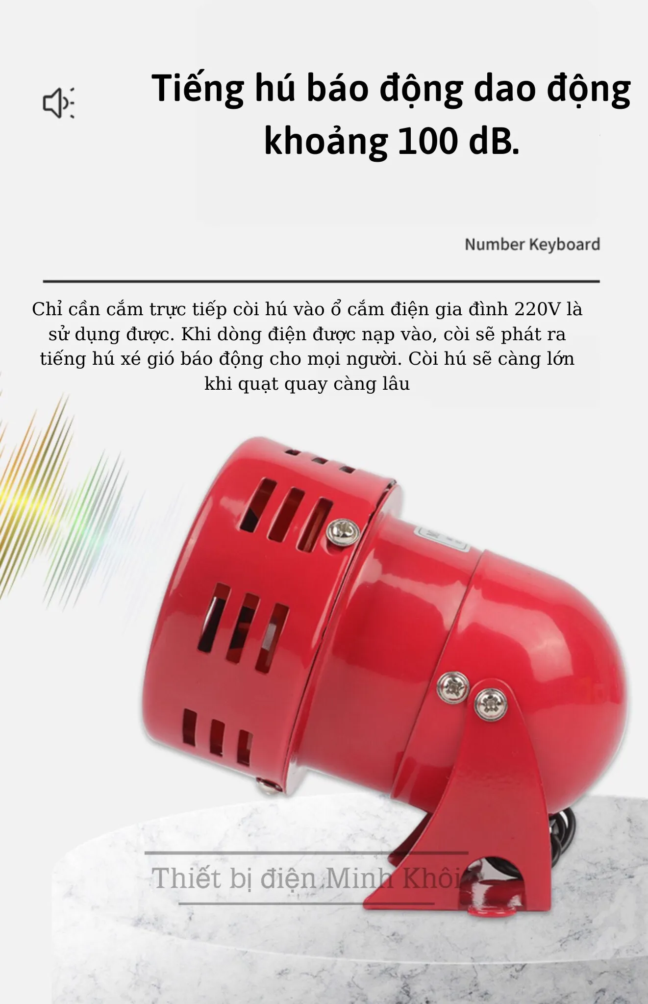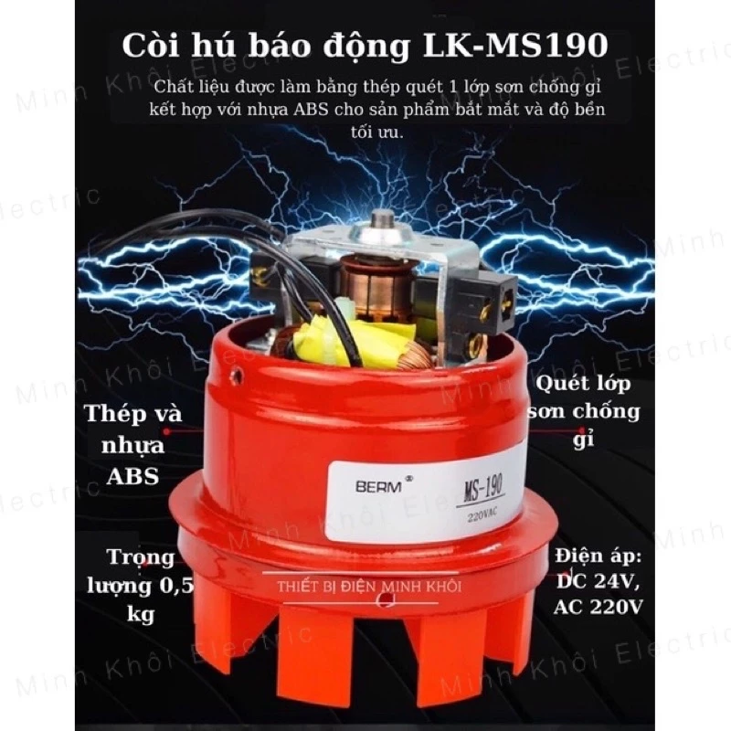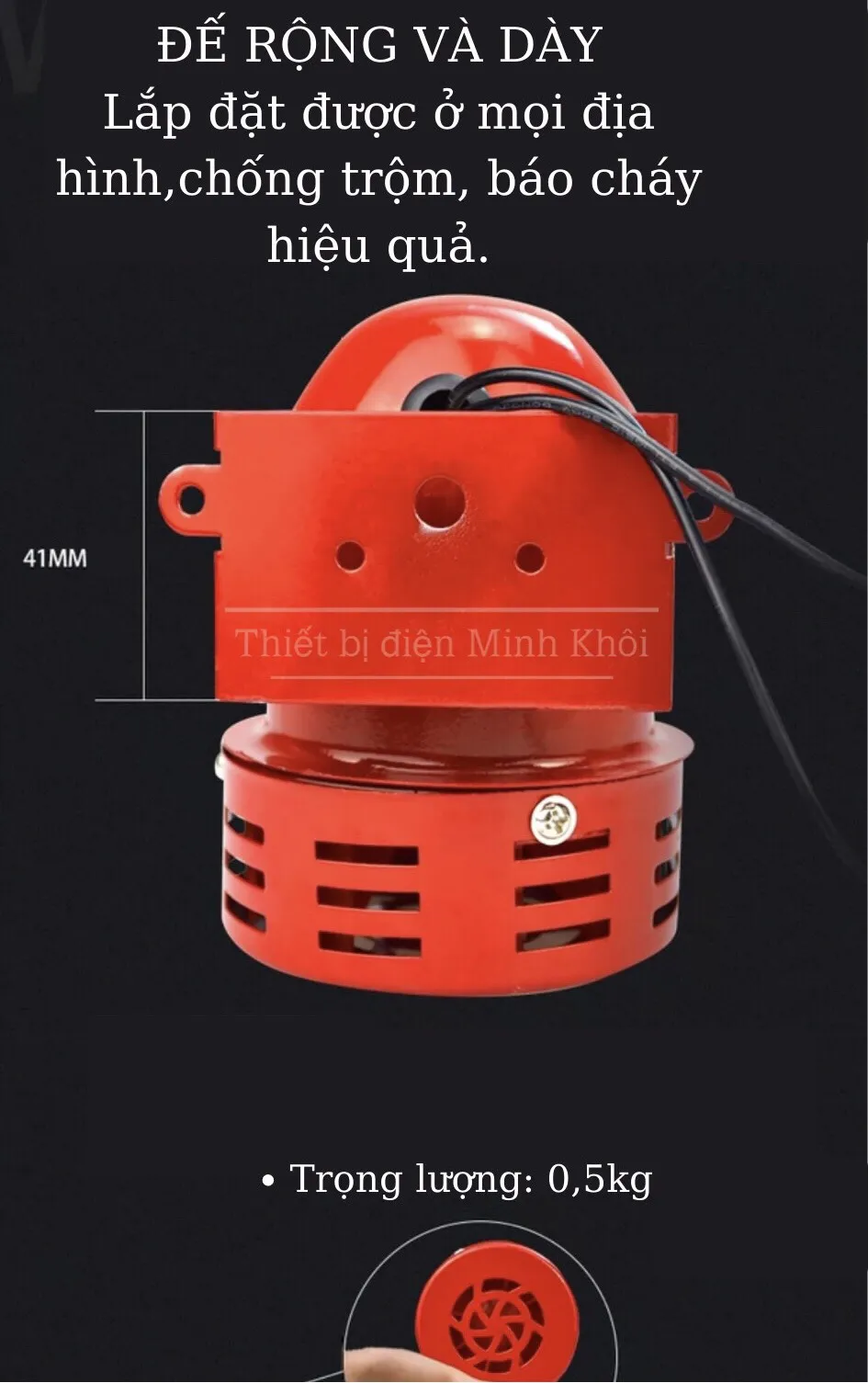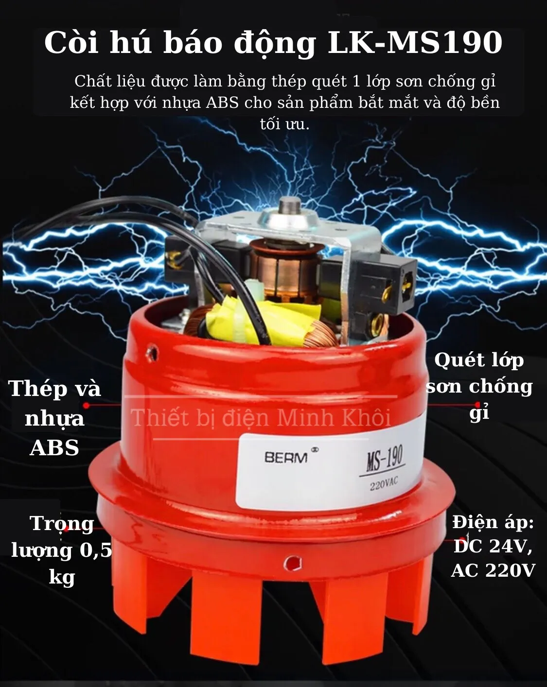 MS 190 Còi hụ báo động hú to, màu đỏ, điện áp 24VDC, 220VAC Còi hụ báo động hú to, màu đỏ, điện áp 24VDC, 220VAC MS 190 chủ yếu được sử dụng trong các môi trường công nghiệp khác nhau, chẳng hạn như nhà xưởng, nhà kho, trong các ngành công nghiệp khai thác mỏ,… (*) Thông số sản phẩm: + Mã hàng: MS 190 + Điện áp nguồn: 24VDC, 220VAC + Tần số: 50-60Hz + Độ ồn: ~ 100 dB + Công suất: 50W + Màu sắc: Màu đỏ + Chất liệu: Kim loại chổng mòn, gỉ (*) Đặc điểm sản phẩm: + Sản phẩm được làm bằng kim loại, đảm bảo độ bền, kiểu dáng nhỏ gọn. + Dùng quạt thổi gió tạo nên tiếng hụ vang với cường độ âm thanh tăng dần và tiếng vang ấm. + Có thể dùng kèm với thiết bị chống trộm hoặc cảm ứng hồng ngoại có chức năng mở rộng thêm thiết bị, báo động công trường, nhà xưởng, biệt thự,… + Thiết kế chắc chắn, dễ dàng lắp đặt và sử dụng. (*) Có giá sỉ cho khách hàng khi mua số lượng nhiều. (*) Chính sách hỗ trợ bán hàng: ✔️ Hỗ trợ vận chuyển trên toàn quốc. ✔️ Hỗ trợ và tư vấn về sản phẩm, lắp đặt trực tiếp qua Zalo 24/24 khi khách hàng có yêu cầu. ✔️ Cam kết về chất lượng sản phẩm, hoàn tiền 💯% nếu phát hiện hàng kém chất lượng, sai mẫu mã. (*) Thông tin liên hệ bảo hành: CÔNG TY TNHH THIẾT BỊ ĐIỆN MINH KHÔI Hotline hỗ trợ 096.298.1499 Hỗ trợ kỹ thuật: 091.222.6660 Giao hàng toàn quốc. MS 190 CÒI HỤ BÁO ĐỘNG HÚ TO, MÀU ĐỎ, ĐIỆN ÁP 24VDC, 220VAC – CAM KẾT VỀ CHẤT LƯỢNG SP