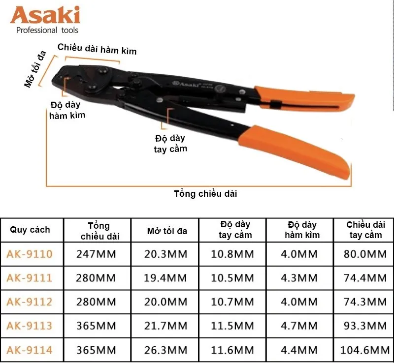 – Kìm Asaki được thiết kế dạng cộng lực để tăng lực cho mũi kìm. Thân kìm có núm vặn giúp người dùng dễ dàng điều chỉnh khẩu độ mở của mũi kìm.