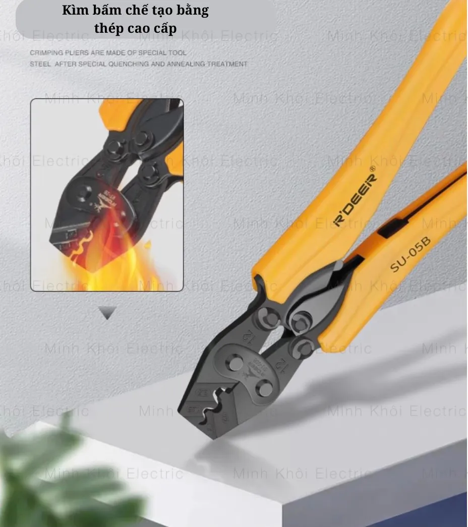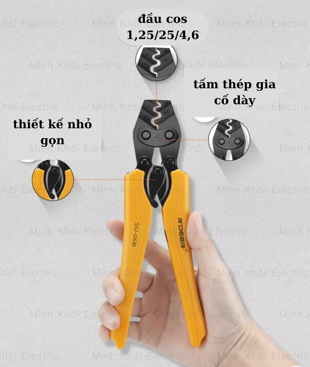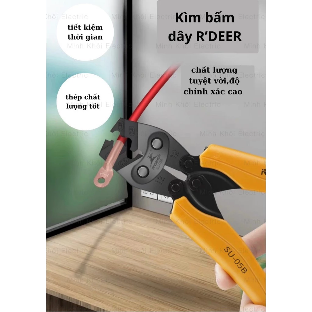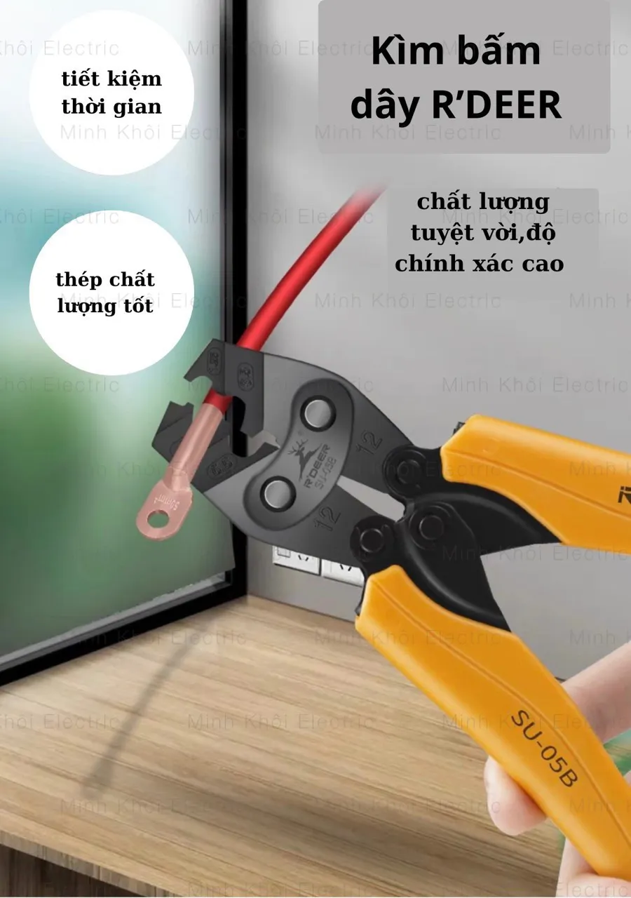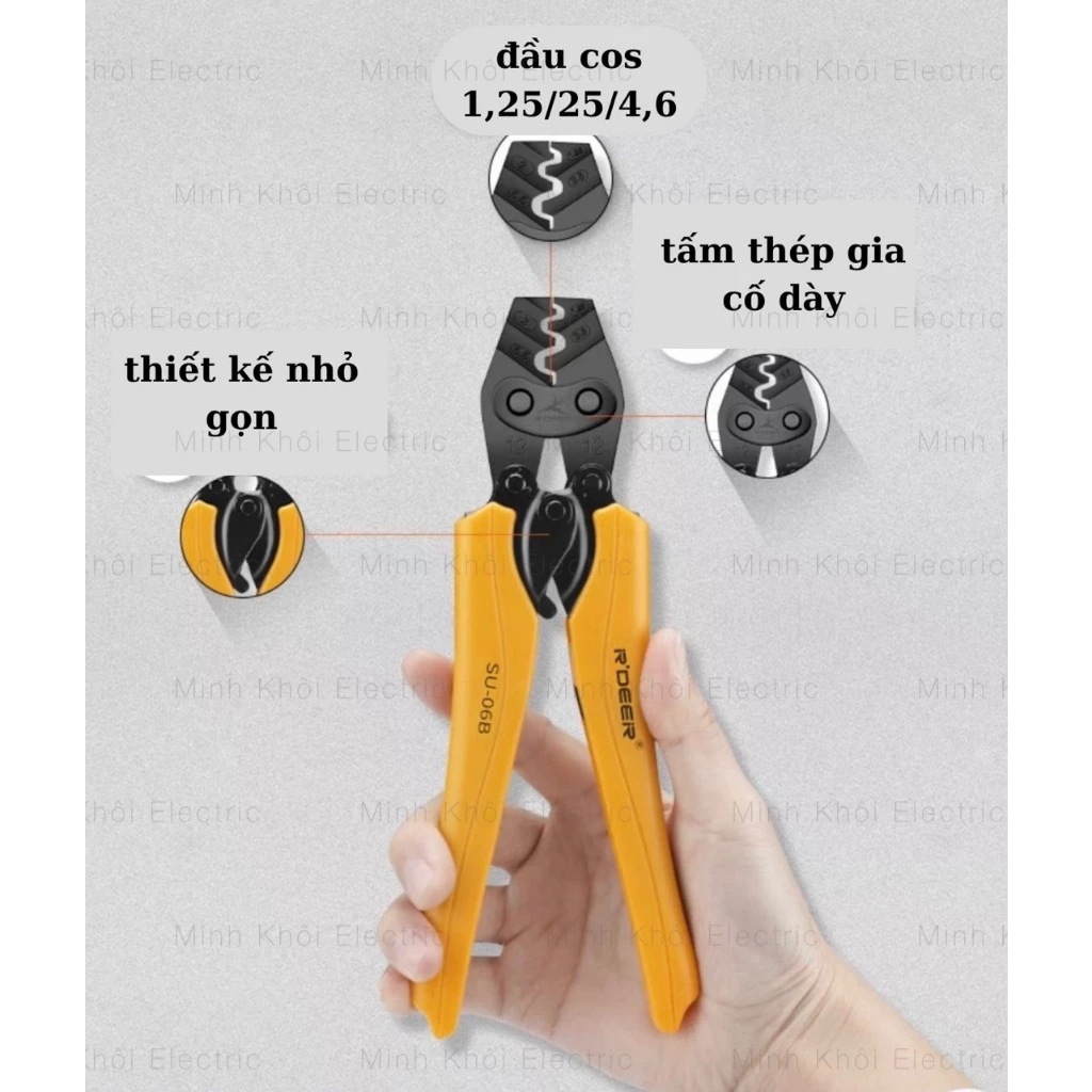 Kìm bấm cos R’Deer SU-06B 0.5-5.5mm chuyên dùng để bấm các đầu mạng các loại cáp viễn thông như cáp điện thoại, cáp mạng LAN. Bấm/ép các đầu cos có thân tròn, bằng kim loại, để kết nối đầu cos đó với dây dẫn điện một cách dễ dàng. Kìm chuyên bấm cos 0.5-5.5mm2 với thiết kế nhỏ gọn, dễ dàng mang đi thích hợp với người thợ.