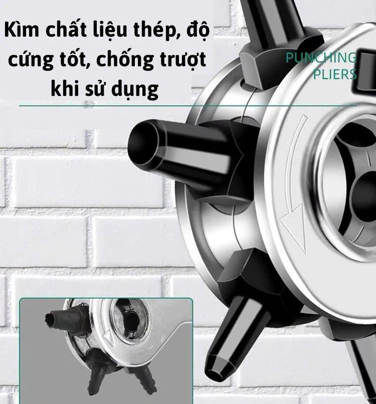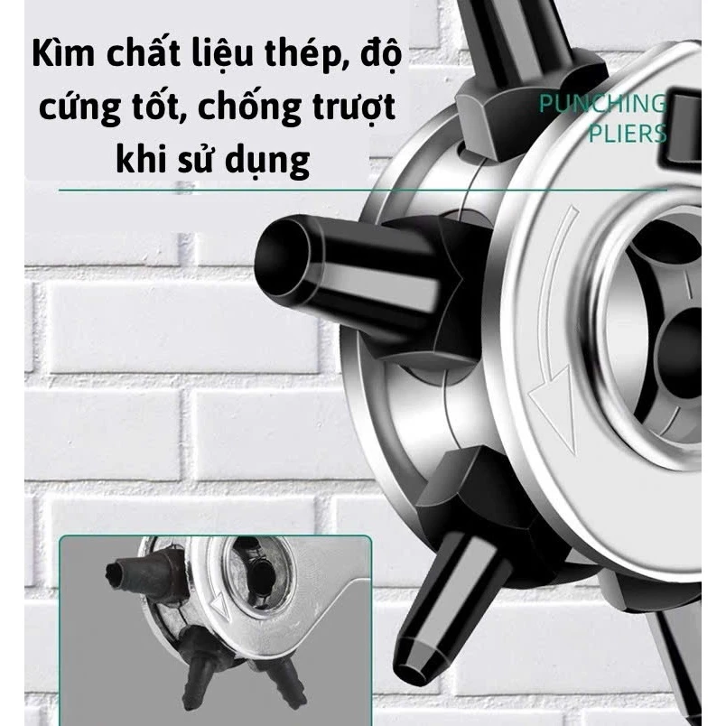 Bước 4: Bóp kìm bấm, khi lỗ dao bấm tiếp xúc với vật liệu cần bấm vào đúng vị trí thì tăng lực bấm để dao bấm xuyên thủng vật liệu