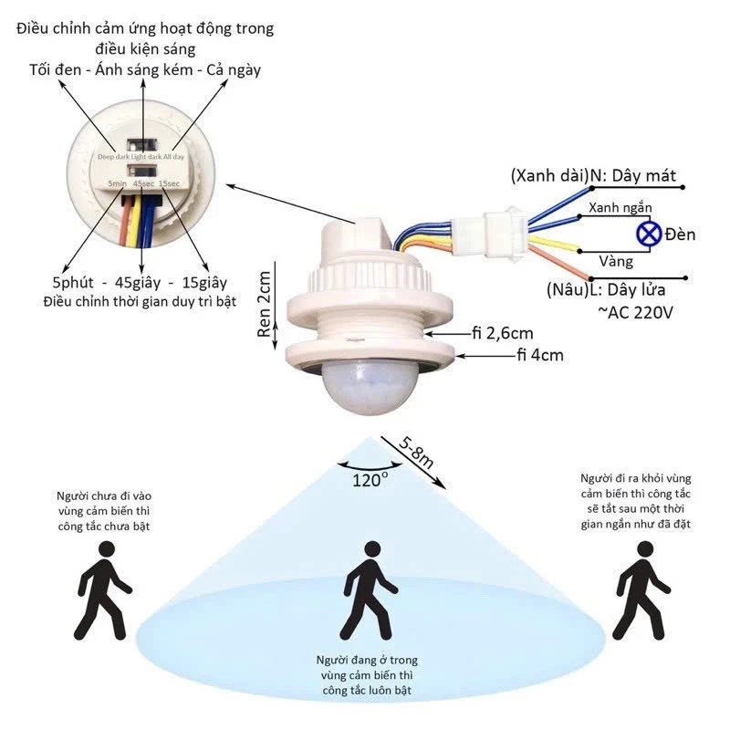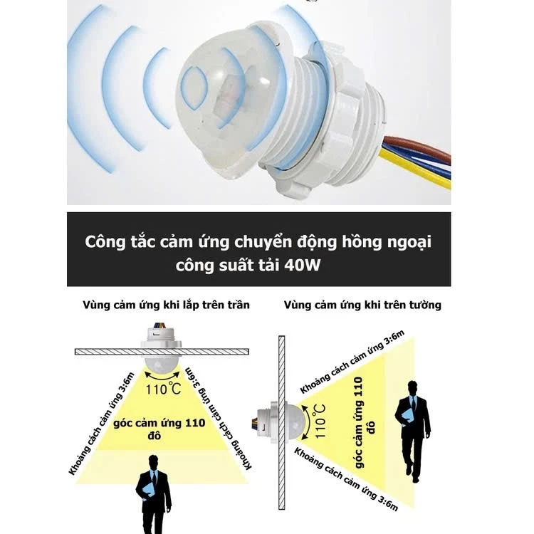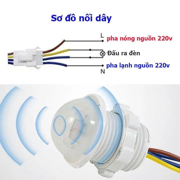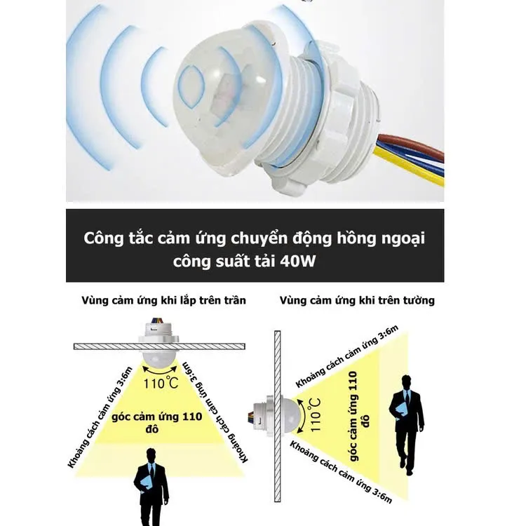 Khi trời tối nếu có người di chuyển trong khu vực quét cảm ứng, lập tức tiếp điểm bên trong sẽ đóng công tắc để mở đèn (có thể lắp còi báo động khi có người đột nhập còi báo sử dụng điện áp 220v).