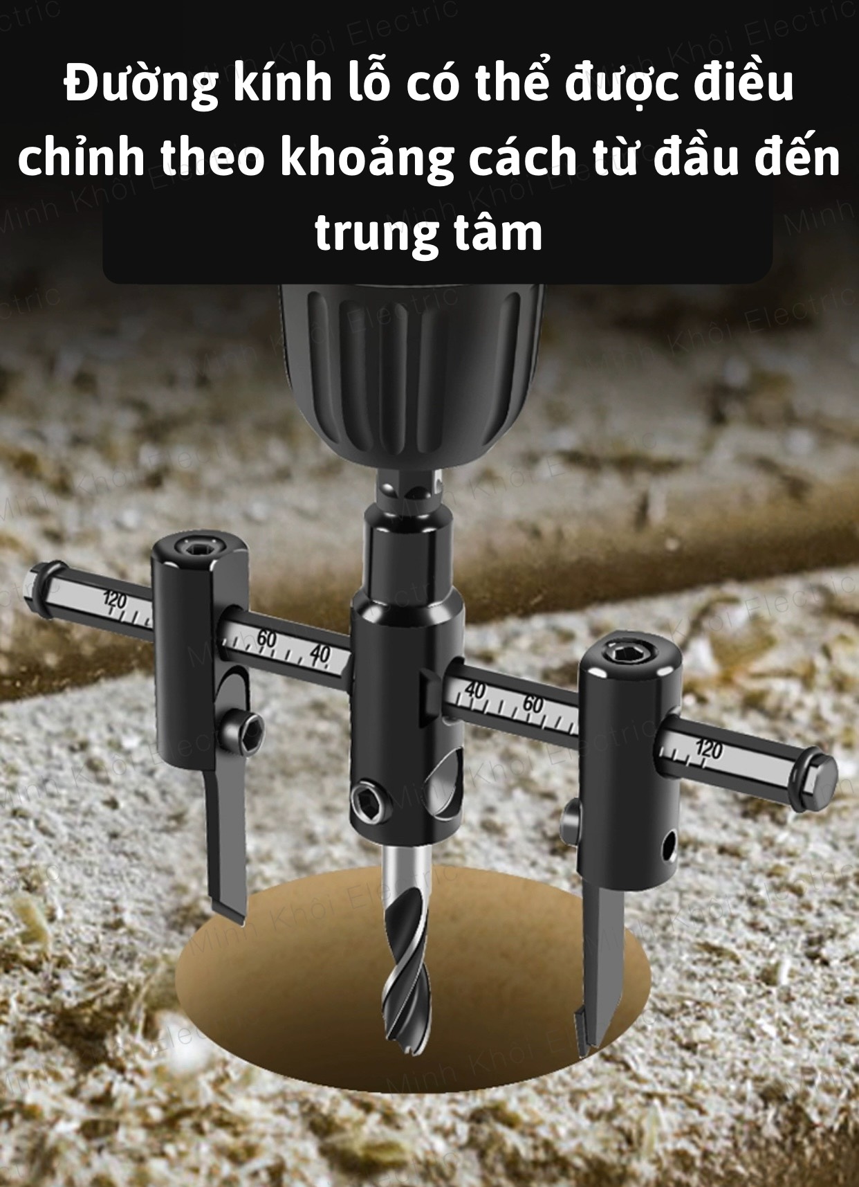 – Được làm bằng chất liệu thép cứng. Mũi khoét bao gồm: 1 mũi khoan làm tâm, 2 đầu khoét nhọn, có thể tăng đưa bằng cách mở chốt hai bên đầu khoét nhọn, kéo hai đầu nhọn theo kích thước lỗ khoét mong muốn. Trên thân ngang có in thang đo với thông số từ 30mm-120mm, với số to dễ nhìn. Khoét được độ dày từ 3mm-50mm.