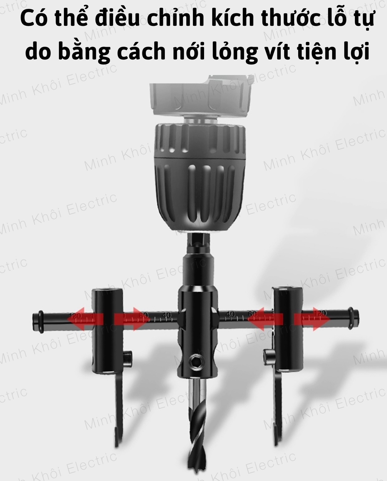 – Được làm bằng chất liệu thép cứng. Mũi khoét bao gồm: 1 mũi khoan làm tâm, 2 đầu khoét nhọn, có thể tăng đưa bằng cách mở chốt hai bên đầu khoét nhọn, kéo hai đầu nhọn theo kích thước lỗ khoét mong muốn. Trên thân ngang có in thang đo với thông số từ 30mm-120mm, với số to dễ nhìn. Khoét được độ dày từ 3mm-50mm.
