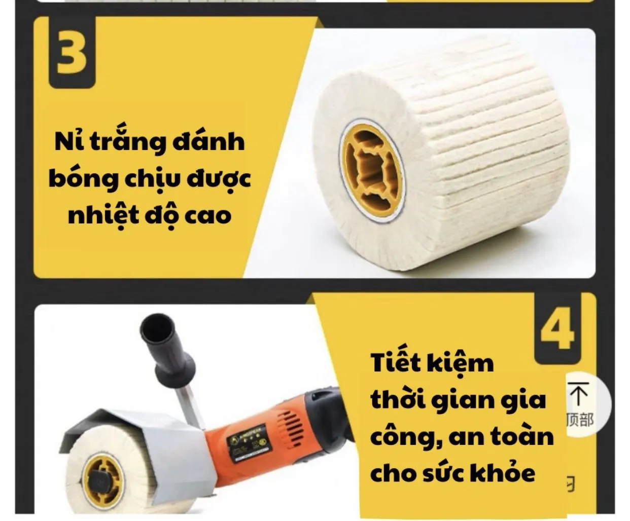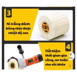 – Trong quá trình sử dụng, bánh nỉ trắng phát sinh rất ít bụi, không bị bám keo nên rất an toàn cho sức khỏe. Thiết kế sản phẩm rất thuận tiện cho việc lắp đặt trên các thiết bị đánh bóng hoặc lắp máy đánh lô cầm ta